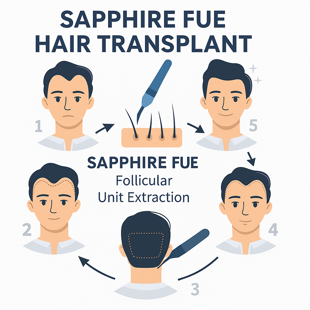 In Sapphire FUE, channels are opened using ultra-sharp sapphire blades instead of traditional steel blades. Sapphire blades create cleaner, smoother incisions, allowing more grafts to be placed with higher density and minimal tissue trauma. This advances the healing process, reduces scabbing, and offers a more natural appearance. Sapphire FUE is preferred for patients seeking maximum density with fast recovery and high aesthetic results.